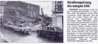 Der maschinelle Abriss mit schwerer Technik des VEB Kreisbaubetrieb wird in der Nachtzum 15. Februar begonnen, wozu wieder eine Vollsperrung der Wilhelm-Külz-Str. notwendig wird. Im vierten Quartal soll dann mit den Erd- und Fundamentarbeiten