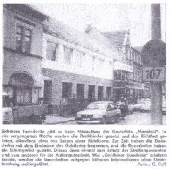 Sichtbare Fortschritte gibt es beim Neubau der Gaststätte "Mansfeld". In der vergangenen Woche wurden die Dachbinder gesetzt und das Richtfest gefeiert, allerdings ohne das Setzen einer Richtkrone. Zur Zeit haben die Dachdecker mit dem Eindecken des Gebäudes begonnen, und die Bauarbeiter haben ein Schutzgerüst gestellt. Dieses dient einmal zum Schutz der Straßenpassanten und zum anderen für die Außenputzarbeit.