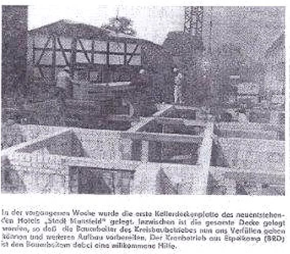 In der vergangenen Woche wurde die erste Kellerdeckenplatte des neuentstehenden Hotels "Stadt Mansfeld" gelegt. Inzwischen ist die gesamte Decke gelegt worden, so dass die Bauarbeiter des Kreisbaubetriebes nun ans Verfüllen gehen können und den weiteren Aufbau vorbereiten. Der Kranbetrieb aus Espelkamp (BRD) ist den Bauarbeitern dabei eine willkommene Hilfe.